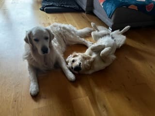 Po pierwszych rozmowach wiemy, że suczka mimo lekkiej niepewności nową sytuacją wykazuje ciekawość oraz próbuje wykazywać pierwsze próby komunikacji jak i zabawy z nowymi właścicielami oraz psim rodzeństwem.