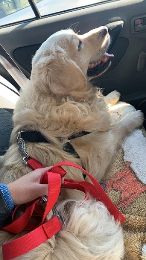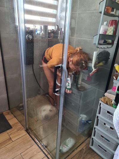 Spodobało mu się domowe spa - kąpanie pod prysznicem i czesanko a nową umiejętność wchodzenia na łóżko bardzo chętnie pokazuje. Bez większych problemów przyzwyczaił się do jazdy samochodem.