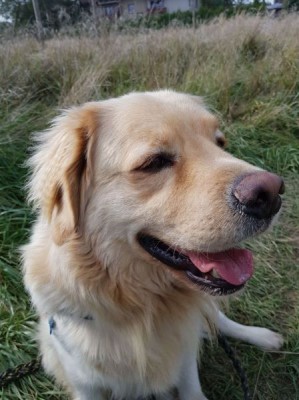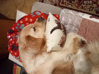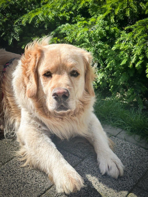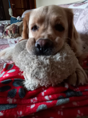 Bardzo lubi przesiadywać ze swoim misiem w ogrodzie przed domem i obserwować przechodniów i psy. Chciałam to ograniczyć, ale szczeka, jeśli nie chcę go wypuścić. Mój poprzedni golden Platon siedział cały czas przy mnie i nieustannie mi towarzyszył.