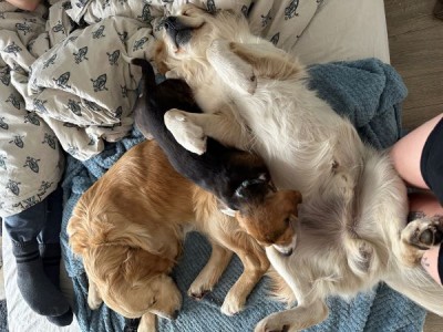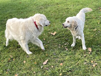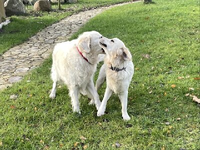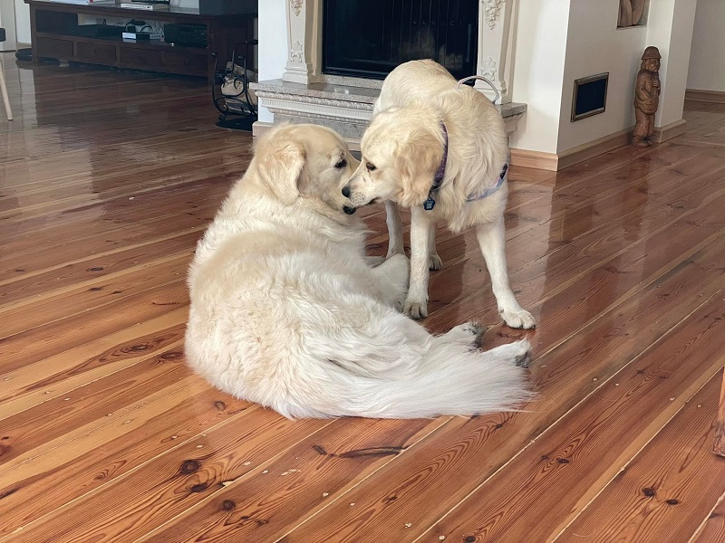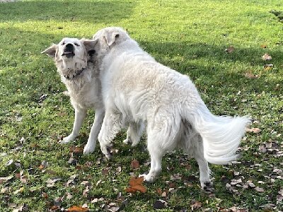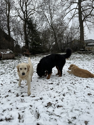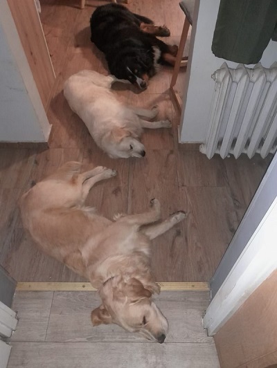 Dużą zasługę w tym zakresie mają 3 inne psiaki, które mieszkają u Pani Patrycji. Bono sporo się od nich nauczył – przede wszystkim zaufania do człowieka ale również (od berneńczyka) – stróżowania 😊
