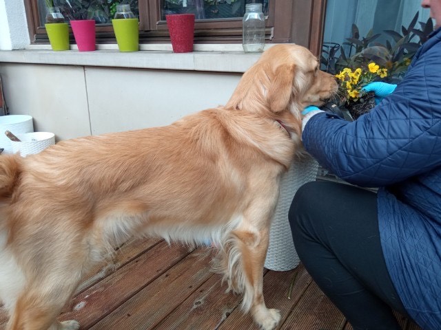 Podczas pełnienia funkcji pomocnika przynosi na swój kocyk zdobycze - łopatkę, pokrowce a nawet doniczki po żonkilach. Chętnie pomoże też w zdejmowaniu kartonów z donic. Przyszła wiosna więc w ogrodzie musi być porządek a na jego kocyku nieco nowości.