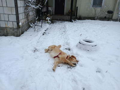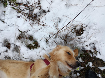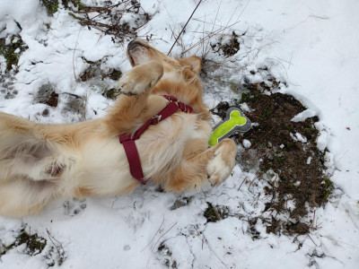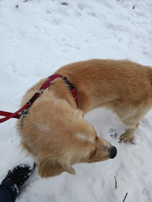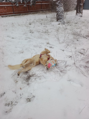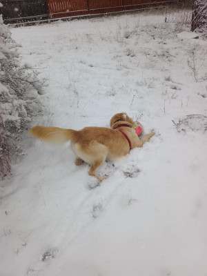 Co zaś się tyczy spacerów, to dzisiaj spadł śnieg - był to pierwszy śnieg Froda u nas. Na początku był nieco zdziwiony, nie wiedział, co się stało z podwórkiem, które zna. Potem trochę się potarzał w śniegu radośnie, ale z tego co zaobserwowaliśmy, to nie podoba mu się, gdy śnieg dostaje się między poduszki w łapkach, więc później ogólnie wolał wracać do domku w miarę szybko.