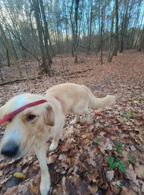 Dzisiaj znowu wzięliśmy Froda na dłuższy spacer. Jako że bardzo ładnie chodzi na smyczy, czuje się komfortowo z sikaniem i robieniem kupy na zewnąrz, to w południe nawet nie przechodziliśmy się po podwórku, tylko od razu poszliśmy poza nie. Dzisiaj znowu poszliśmy do lasu, choć nieco inną drogą, gdzie wcześniej Frodo nie był. Na tym spacerze byliśmy ogólnie godzinę, także dużo było nowych zapachów itp., ale znowu Frodo był bardzo grzeczny, dzielnie to znosił, obwąchiwał wszystko i co jakiś czas oznaczał teren.