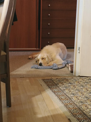 Wieczorem pierwszy raz piszczał kiedy leżał na swoim kocyku a opiekunowie byli w innym pomieszczeniu. Najpierw nie wiedzieli dlaczego, obejrzeli go dokładnie, ale kiedy nie znaleźli żadnych niepokojących objawów to doszło do wnioski, że po prostu mogło mu się coś przyśnić a w tej najgłębszej fazie snu psy czasem wydają odgłosy i ruszają np. łapkami co jest zupełnie naturalnym zjawiskiem:).
