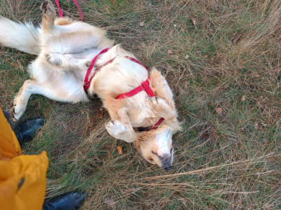 Na południowym spacerze z kolei ja byłem z nim sam, pokręciliśmy się trochę po podwórku i znowu wziąłem go na smycz za podwórko. Dawałem mu przestzreń do wąchania itp., ale coś wyczuwał i ten zapach go interesował dużo bardziej niż ja. Sam z siebie w ogóle nie przychodził, ignorował też jakiekolwiek wołanie i polecenia, nie chciał też wracać na podwórko - ciągle tylko stał i węszył coś. Zakładamy, że może przechodziła jakaś suczka z cieczką i to go tak zainteresowało? Z tego powodu daleko nie zaszliśmy, po jakimś czasie w końcu udało się go zaciągnąć (nie dosłownie) do domu. Po powrocie na podwórko jeszcze z nim chwilę pochodziłem na smyczy, żeby zobaczyć, czy dalej będzie taki pobudzony, ale już wrócił do spokojnego zachowania, ewidentnie przestał wyczuwać ten zapach.